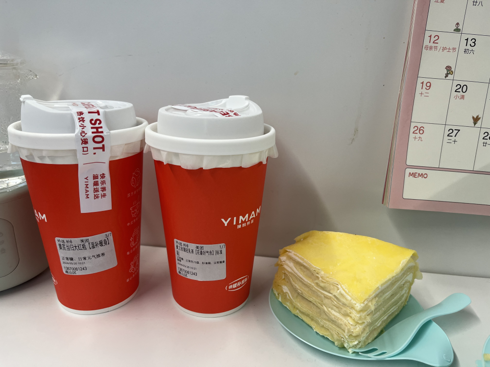 这个牌子第一次吃到就是你给我点的,好吃到连我的同事也赞不绝口,印象深刻。怀孕后为了控糖,很久都不敢吃榴莲千层,看到这久违的“老朋友”还是有点亲切和怀念。虽然早上收到蛋糕是头一回,但是心里觉得挺好,蛋糕就应该早点吃,早点消化,不怕变胖。我破例吃了半个蛋糕,两大块。上午一块,下午一块。吃一口就停不下来了呢。除了千层蛋糕,还有额外的养生甜茶热饮。可以说是非常贴心和周到了。在糖分得到极度满足的一天,连周一都觉得无比愉快了呢。