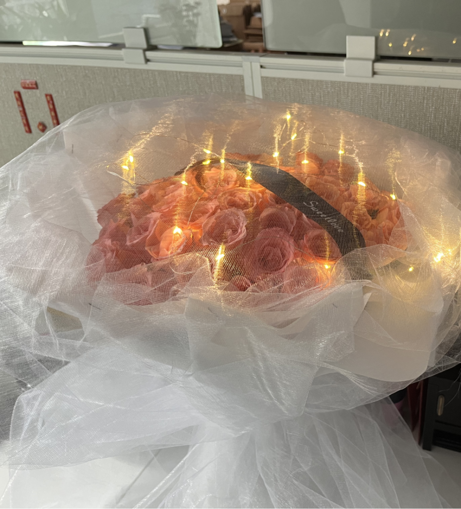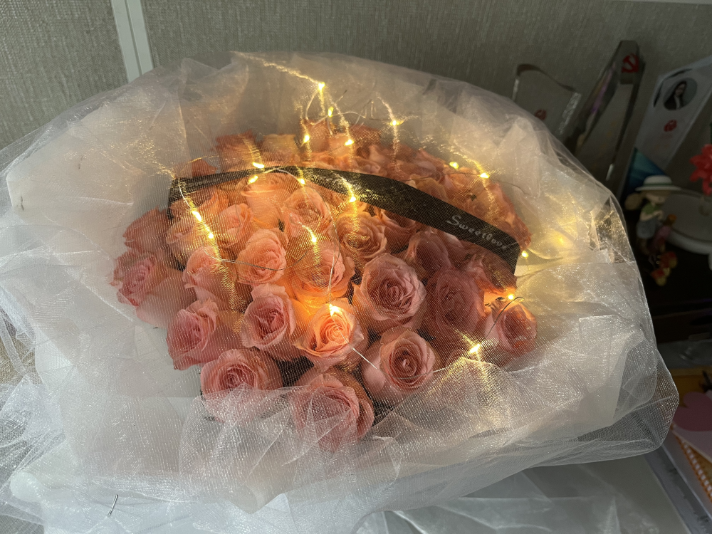当然,我没有忘记你给我精心挑选的花束,52朵粉玫瑰。带着白色的轻纱和闪亮的灯串,闪着晶莹的露珠,带着你的无限爱意而来。