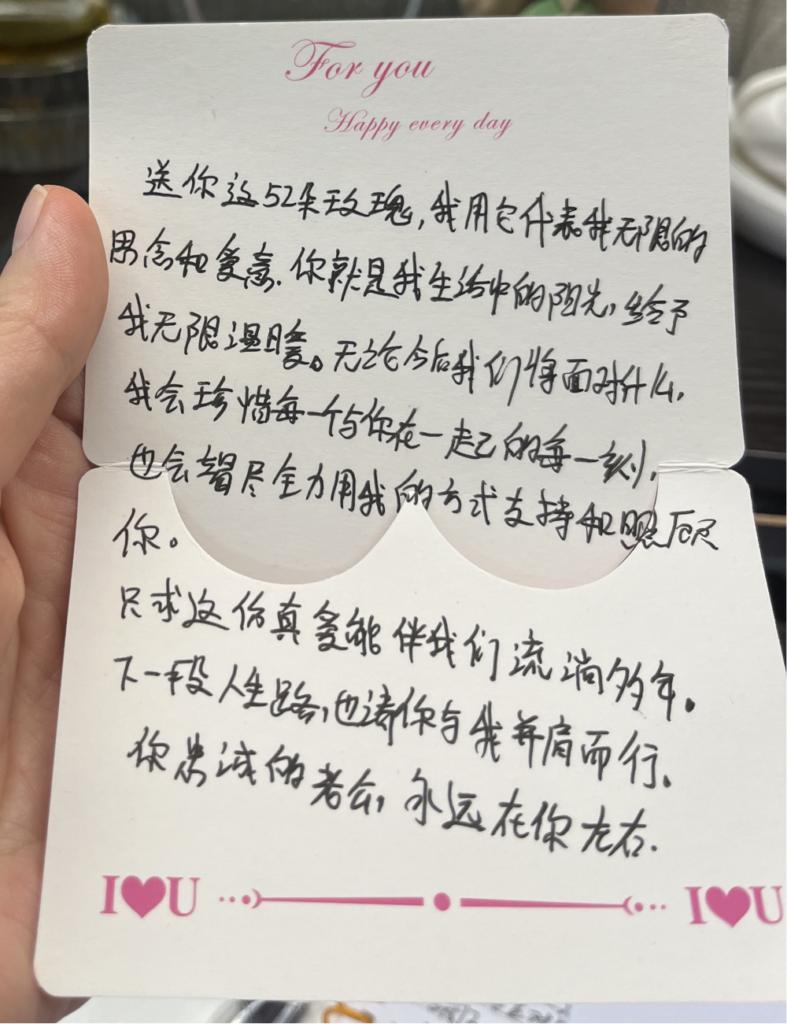 贺卡上的话语,真挚而浪漫,是我读过最好的情话。你总能用最简单朴实的话语打动我,这就是最好的爱意和承诺,胜过世上所有文采斐然的句子。让这份真爱伴随我们流淌一生,我也会一直守候你,珍惜你,陪伴你,支持你,照顾你,全心全意爱你。